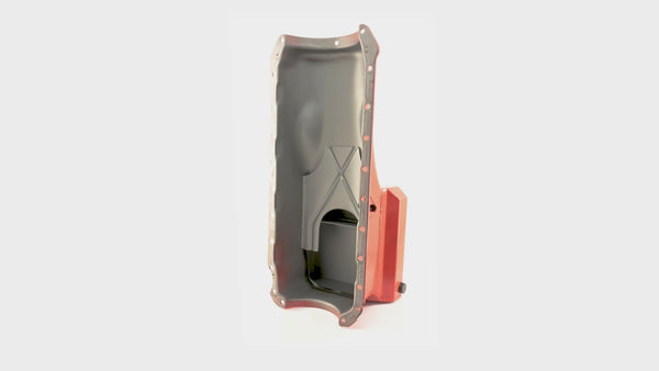 Compatibility: Fits 1965–1990 Chevy big block V8 engines: 396, 402, 427, 454. Passenger Side Dipstick: Designed for traditional big block Chevy configurations. 6-Quart Capacity: Holds extra oil to support high-performance engines during racing conditions. 8-1/4" Deep Sump: Provides additional oil volume and clearance for performance upgrades. Trap Door Baffle: One trap door helps prevent oil starvation during acceleration and hard cornering. Painted Orange Finish: Offers heat resistance, corrosion protection, and a classic high-performance look.