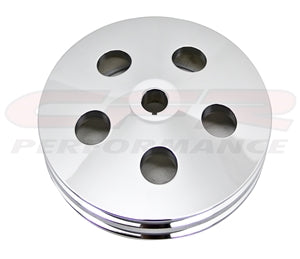 Polished finish aluminum power steering pump pulley. The pulley is a double (2) groove pulley and fits all Chevy/GM key-way units through 1972.