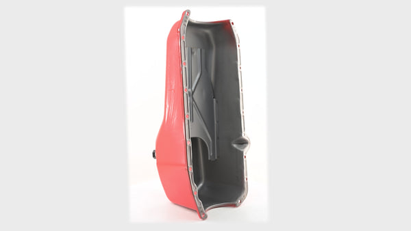 Restore or upgrade your classic Chevy small block engine with this CFR Performance steel oil pan, specifically built for 1980-1985 Chevy 267, 283, 305, 327, and 350 V8 engines. This durable painted orange steel oil pan features a 4-quart (stock) capacity, making it perfect for factory replacements or retro-themed engine builds. It includes a rear sump, passenger side dipstick, and is designed for engines using a two-piece rear main seal. The oil pan is baffled to help maintain consistent oil flow, and you can use the original oil pump pickup.