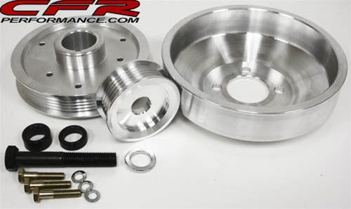 Machined finish aluminum billet 6 groove serpentine Alternator, crank and water pump pulley set. These are for the Ford mustang GT 1999-2000 4.6L engine. long water pump the long style water pump, 1 7/8". wide, as measured from the pulley face. The pulleys are CNC-machined from the lightest, most durable materials possible; 6061-T6 aluminum billet.