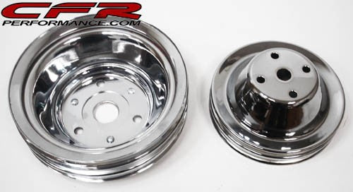 Chevy small block long water pump pulleys set. This set includes a two groove chrome steel water pump pulley and a chrome steel three groove crankshaft pulley. water pump pulley is 6.30" diameter and crank pulley is 7.80" diameter.