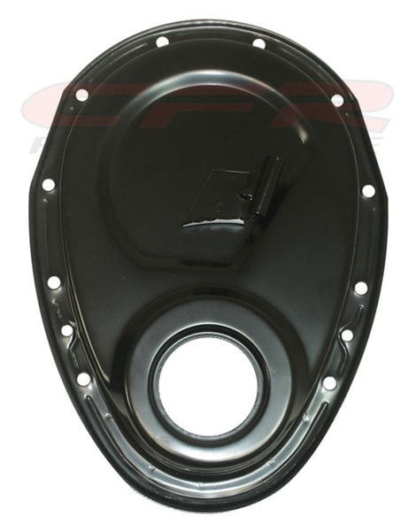 Upgrade your Chevy small block engine with this CFR Performance painted black steel timing chain cover, designed for a clean factory-style fit and finish. The cover features an integrated timing tab positioned 5" from the top, ideal for use with medium diameter harmonic balancers.