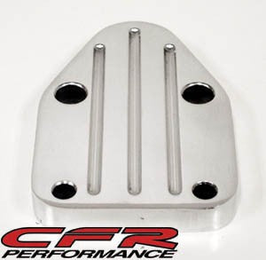 Polished aluminum ball milled fuel pump block off plate fits Chevy small block 283-302-305-307-327-350-383 and 400 V8 engines. It is designed to block off the fuel pump mounting on the cylinder block when a mechanical fuel pump is not used. Does not include bolts or gasket.