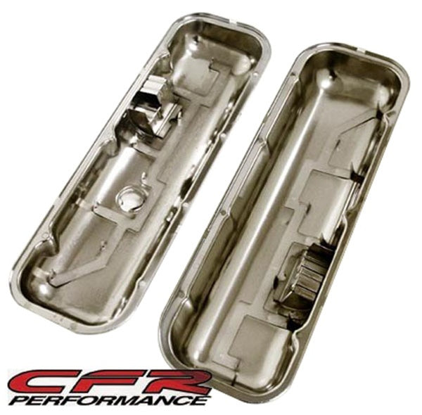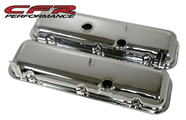 Upgrade your Chevy big block with CFR Performance steel OEM style short valve covers in chrome with dripper rails, combining classic appearance with practical oil management and a brilliant finish for a clean, reliable engine bay.