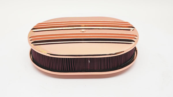 Add custom style and reliable performance to your engine bay with this Aluminum 12" Oval Air Cleaner featuring a striking copper finish and partial finned top. Designed to fit most 4-barrel carburetors with a 5-1/8" diameter neck—including Carter, Edelbrock, Holley, Rochester, and Quadrajet—this air cleaner is perfect for hot rods, muscle cars, and classic restorations.