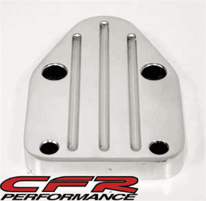 Chrome aluminum ball milled fuel pump block off plate fits Chevy small block 283-302-305-307-327-350-383 and 400 V8 engines. It is designed to block off the fuel pump mounting on the cylinder block when a mechanical fuel pump is not used. Does not include bolts or gasket.