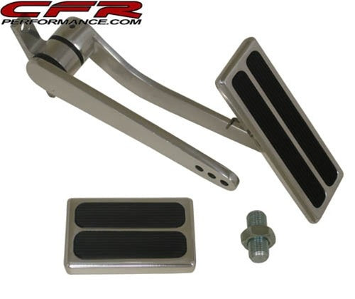 Universal polished aluminum gas pedal has a pad with 2 non-slip rubber inserts. Gas pedal is a firewall mount style and the angle is adjustable with set screw. Gas pedal dimensions: 1-1/2" x 4" Universal polished aluminum brake pad has a 2 non-slip rubber inserts. Brake pad dimensions: 3-1/8" x 2"